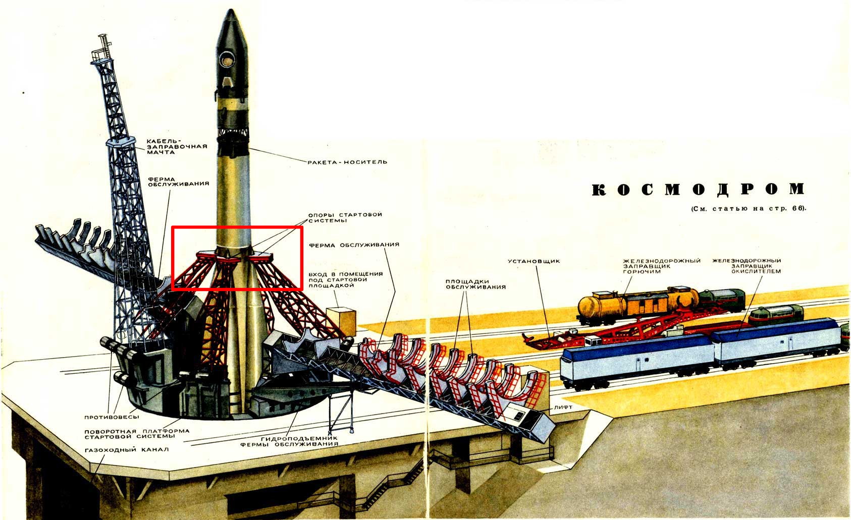 Zitat Following the delivery of the Soyuz rocket to the launch pad, the Service Cabin, KO (a Russian abbreviation for "Kabina Obslyzhnivaniya"), moves into position around the wide base of the rocket under the launch pad. A series of access bridges then are deployed and raised vertically to form a three-level scaffolding just inches from the vehicle. The bridges provide access for the launch personnel to the first and second stage of the rocket at three levels, all located below the main concrete surface of the launch pad. The structure is used by fueling personnel to connect kerosene and liquid oxygen supply lines from the launch complex propellant storage to the multiple propellant tanks onboard the rocket.